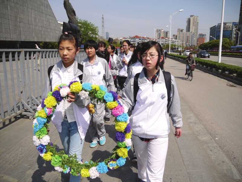 接下来参观的是大屠杀纪念馆,那里记录的是中华民族的一段屈辱史,更是激励现代人自立强国的最好教材。在大屠杀纪念馆,学生怀着悲愤的心情,打出“勿忘国耻,发奋图强,共同追求中国梦”的条幅,并将自制的花环放置成奥运五环的形状,以表达对逝者的哀思和对和平的渴望,盼望五大洲心手相连、共同前进的情怀。同时,这也激发了学生自立、自强,建设强大祖国的理想和追求。