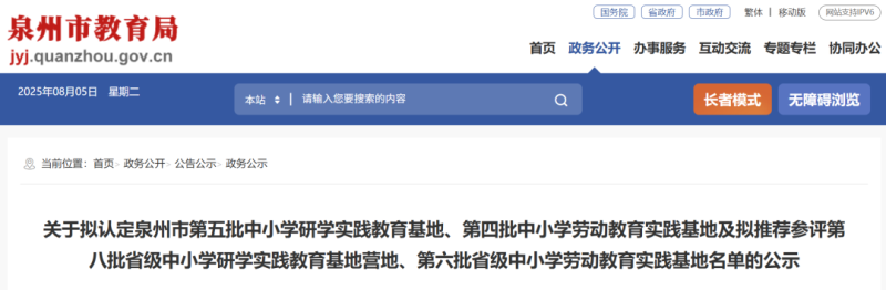 2018年7月,泉州市教育局公布了首批中小学生研学实践教育基地名单;